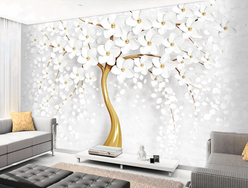 Papier peint arbre avec de petites fleurs blanches (article a91232 ) de la catégorie Papier peint Fleurs 3D