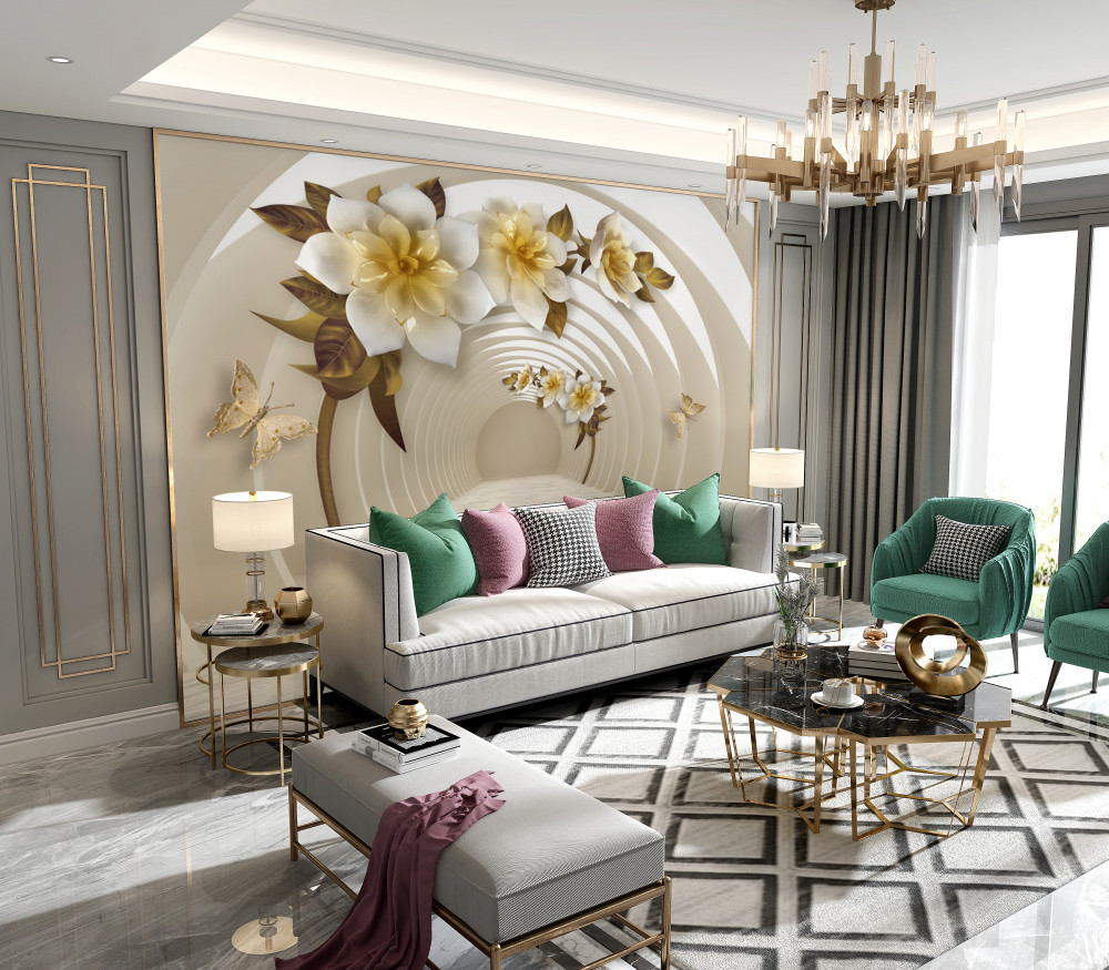 Papier peint Bianchi Lotus Flowers avec de l'or en perspective (article a91035 ) de la catégorie Papier peint Tunnel 3D