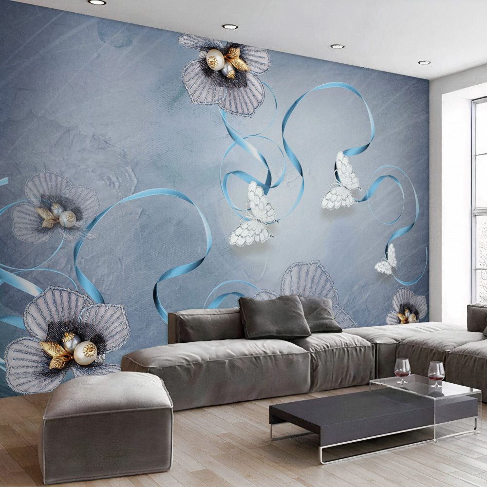 Papier peint Fleurs avec des perles et des papillons blancs