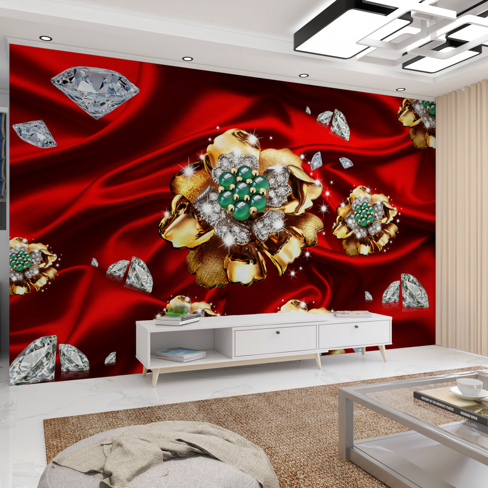 Papier peint Fleurs dorées et diamants sur la soie rouge (article pb4460 ) de la catégorie Papier peint Fleurs 3D