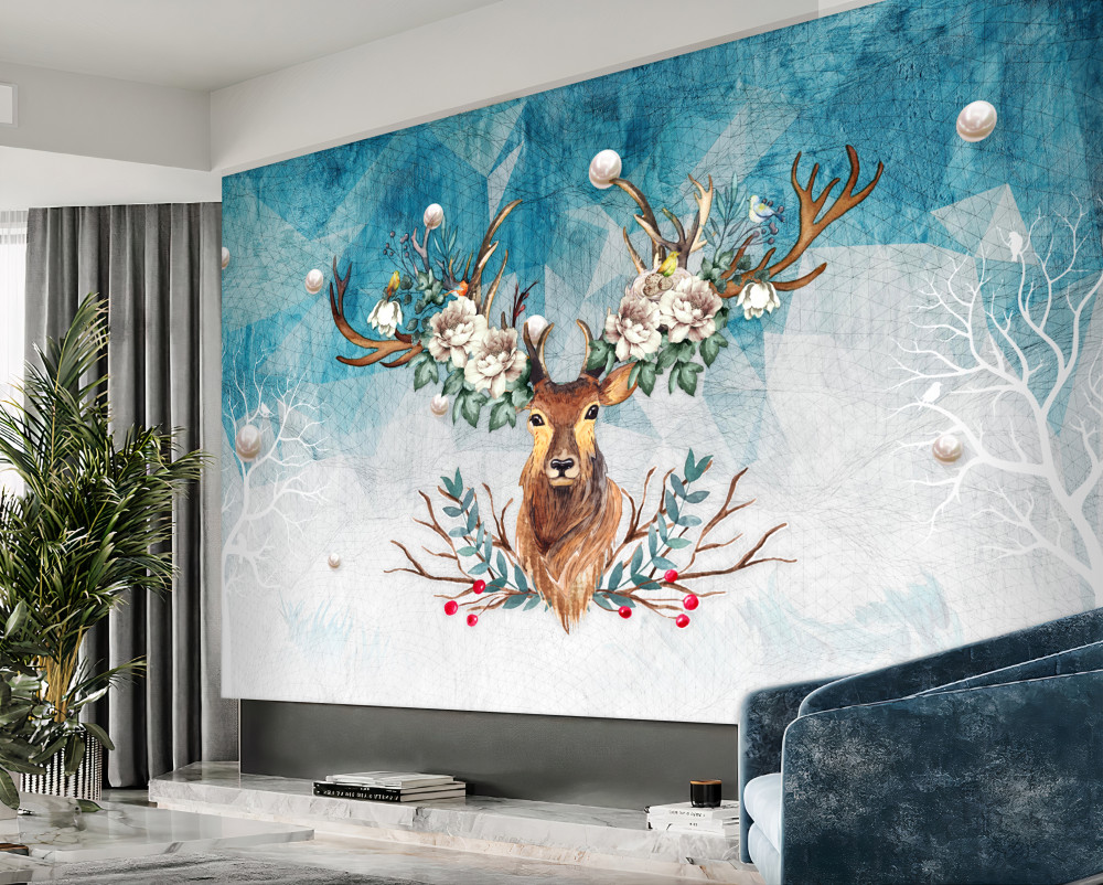Papier peint Cerf aux fleurs sur les cornes en hiver