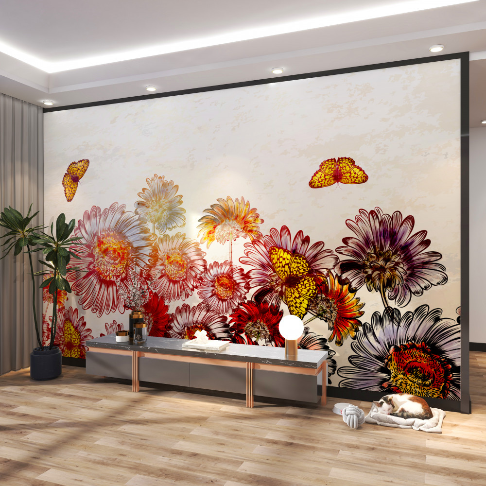 Papier peint Les papillons volent sur les fleurs brillantes (article pb1132 ) de la catégorie Papier peint Floral