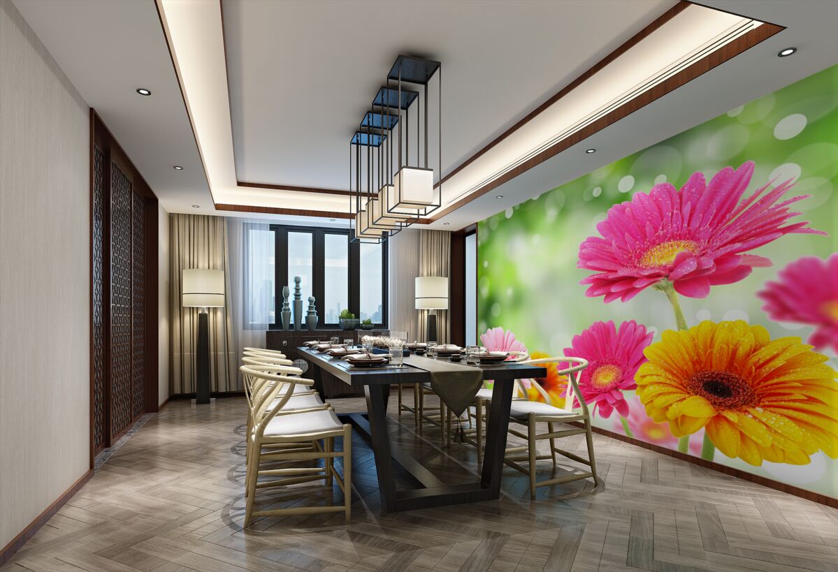 Papier peint Fleurs blanches et vertes et formes géométriques