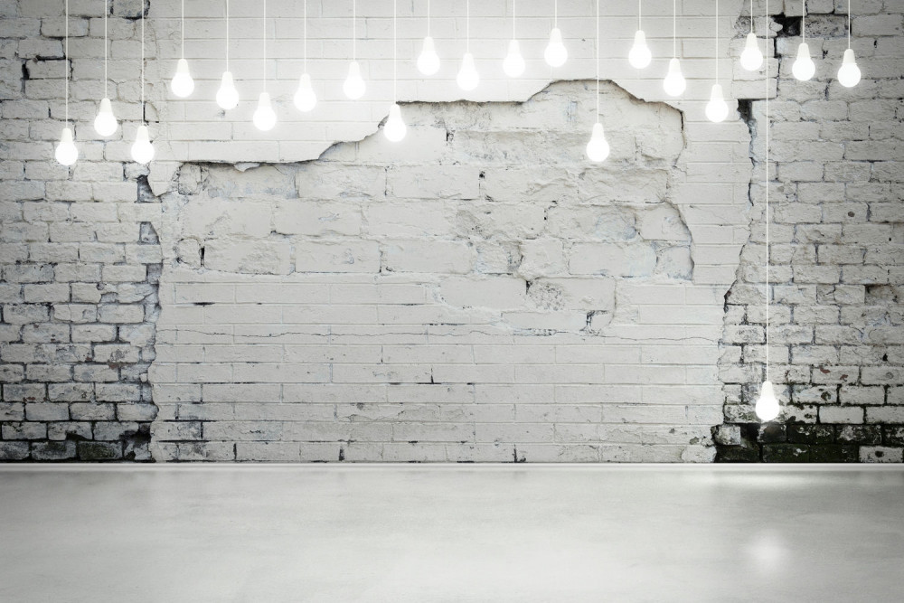 Papier peint ampoules sur un fond d'un mur de briques blanc (article a87954 ) de la catégorie Papier peint Brique