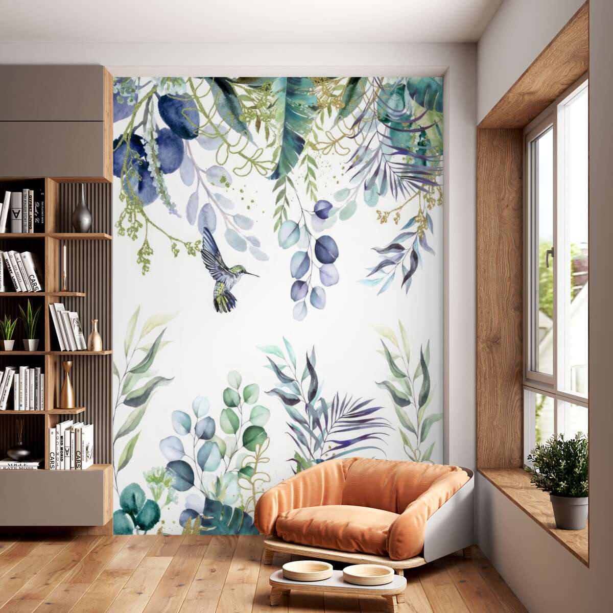 Papier peint Oiseaux sur les branches à fleurs sur fond bleu