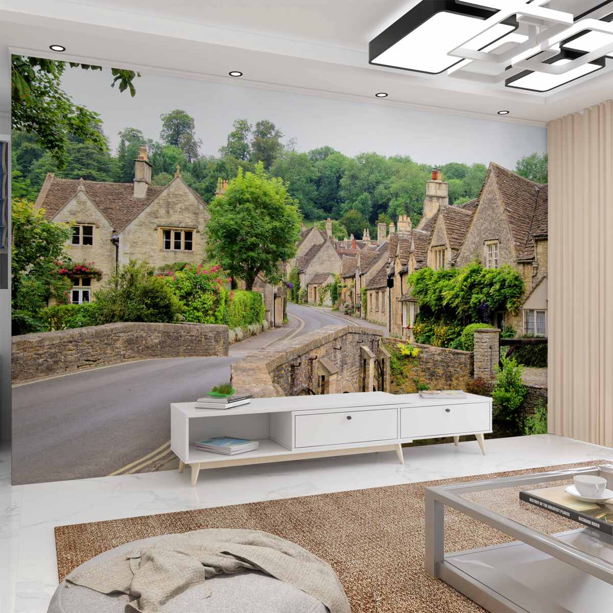 Papier peint vieilles maisons avec musc vert et pont