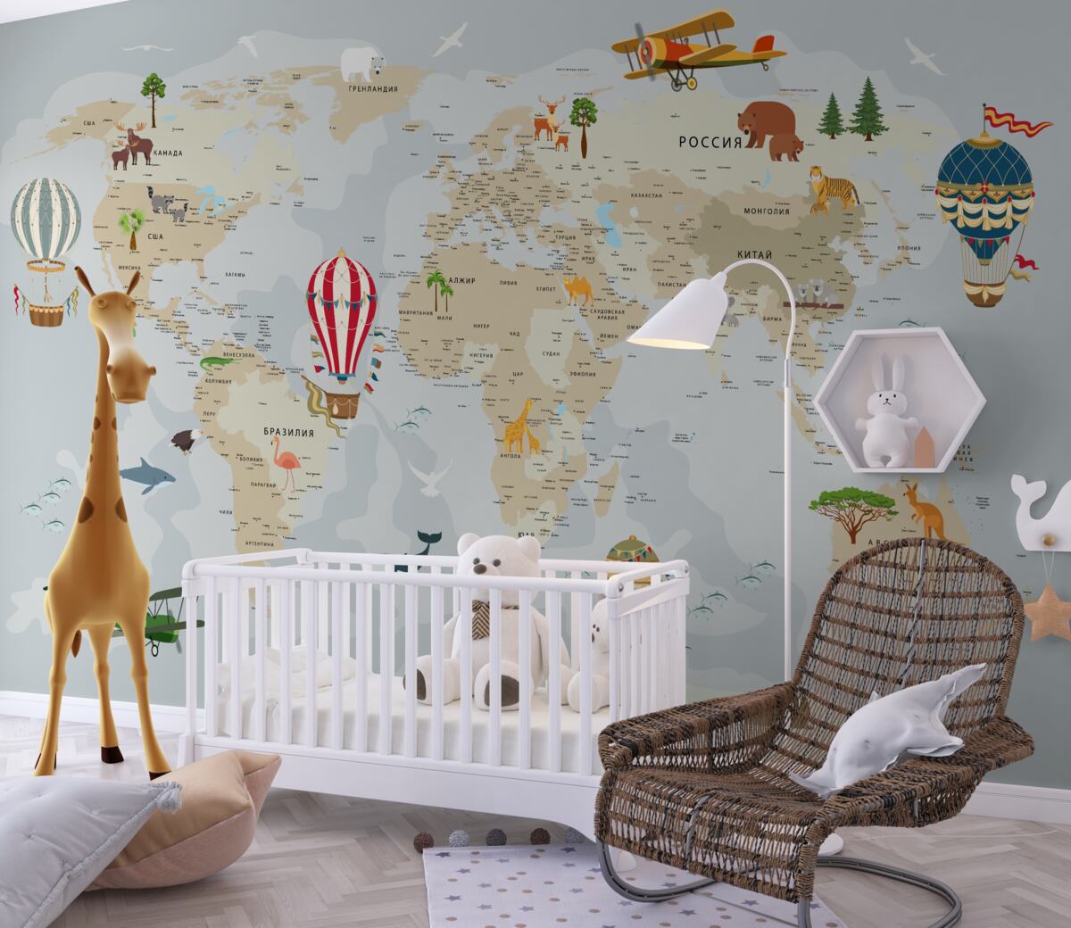 Papier peint Carte du monde avec les animaux et le transport (article a91495 ) de la catégorie Papier peint Pour les enfants