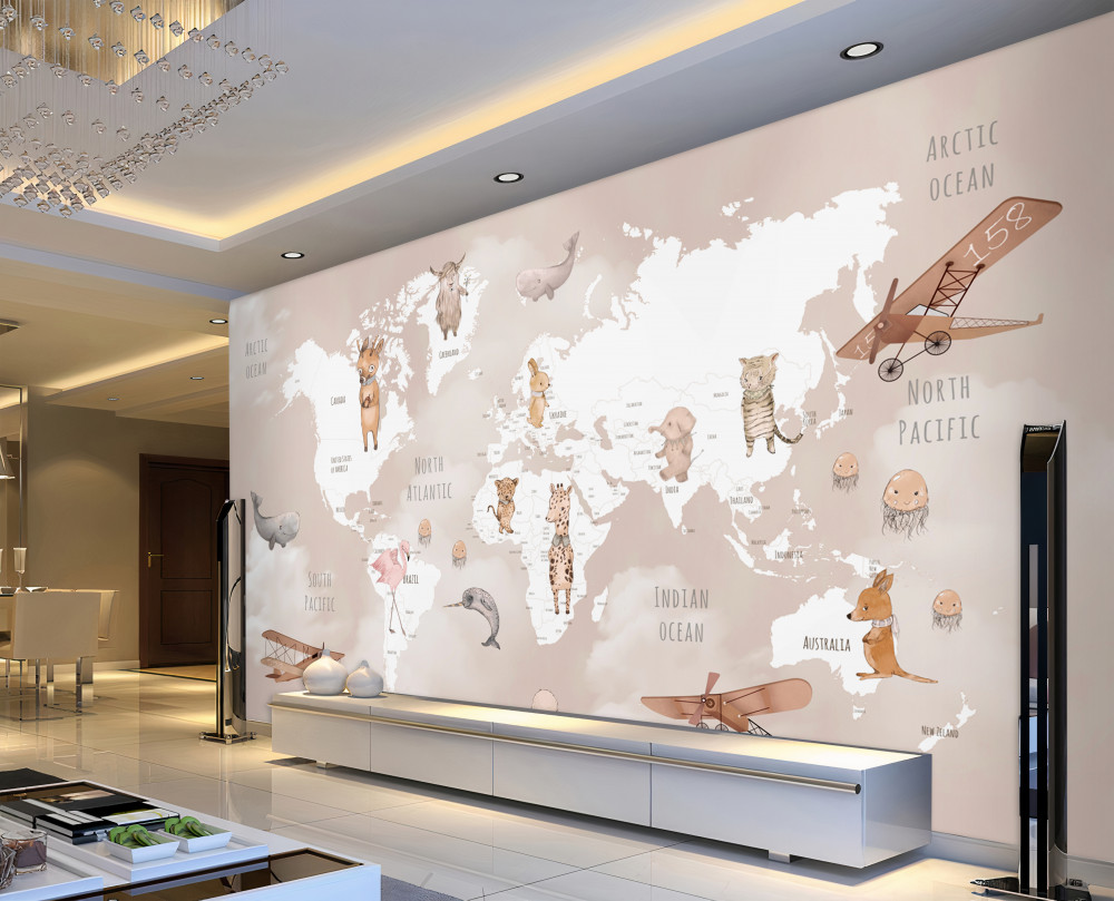 Papier peint Carte du monde avec les animaux et les avions (article a93019 ) de la catégorie Papier peint Pour un garçon