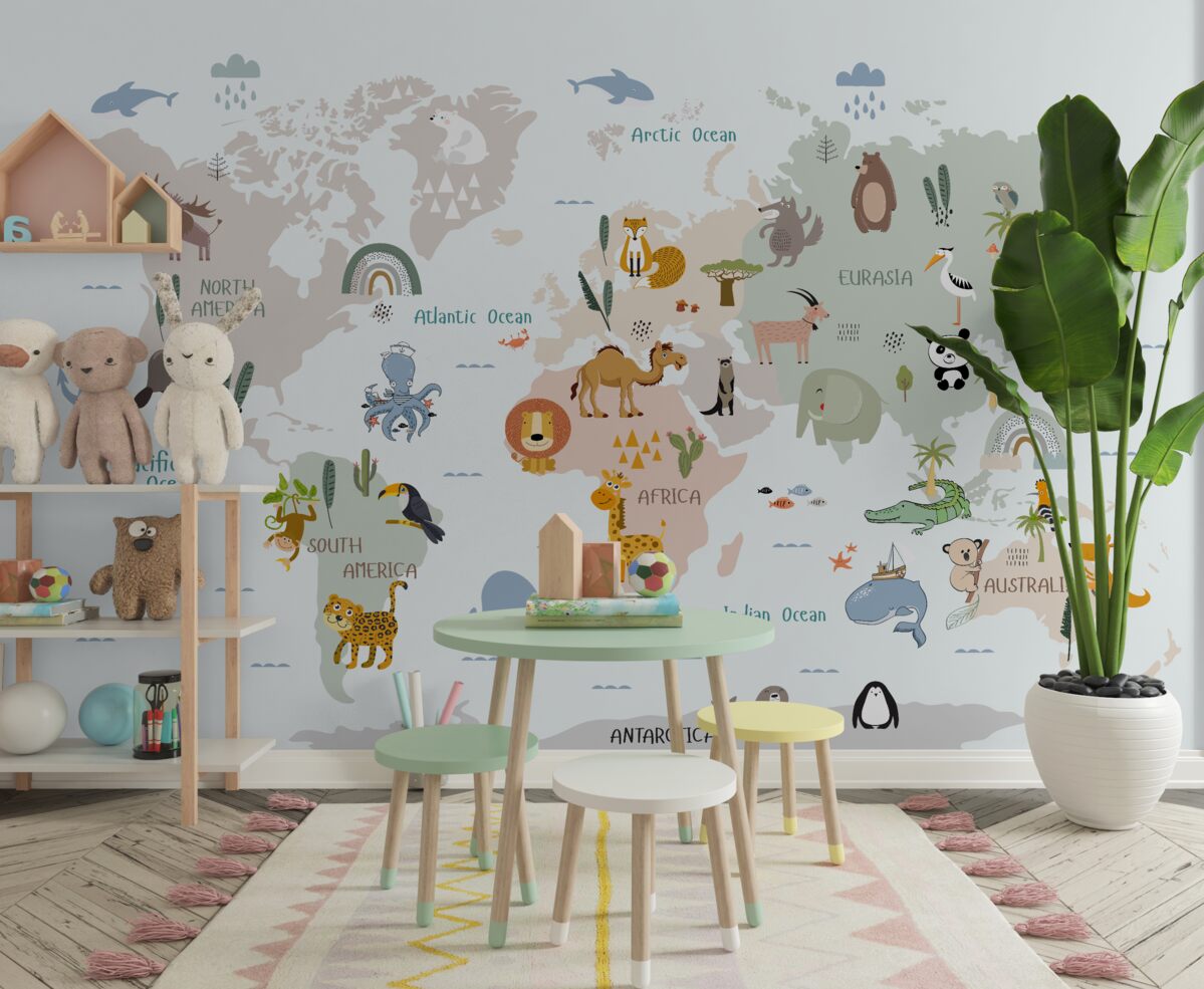 Papier peint Carte du monde et représentants des continents (article a98115 ) de la catégorie Papier peint Pour les enfants