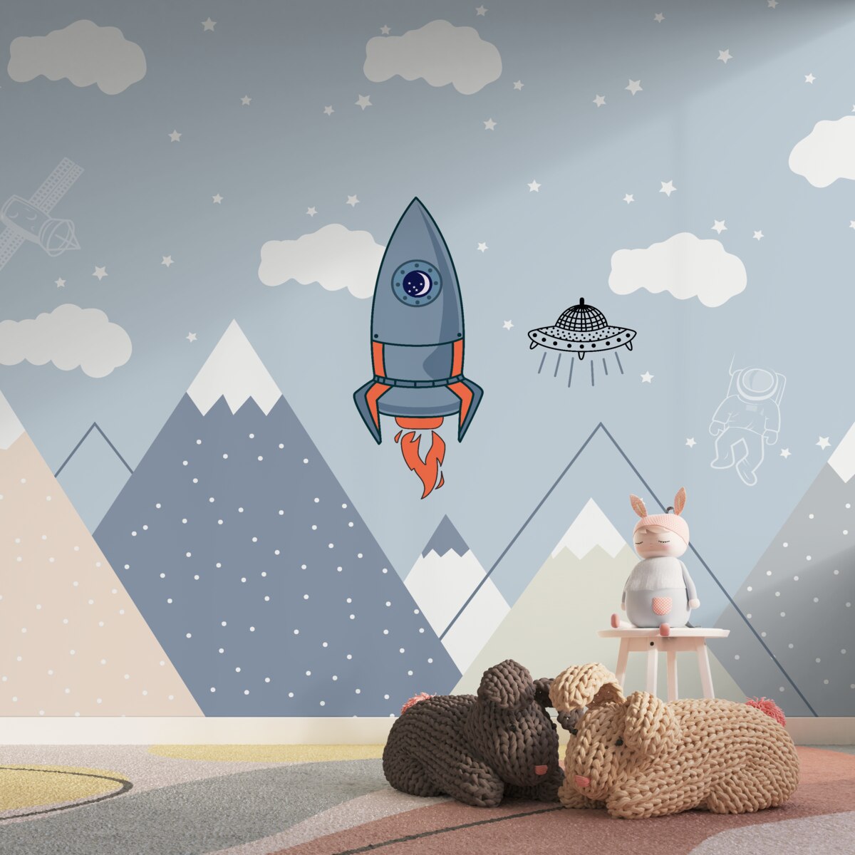 Papier peint Des roquettes et des ovnis décollent dans les montagnes (article a91532 ) de la catégorie Papier peint Pour les enfants