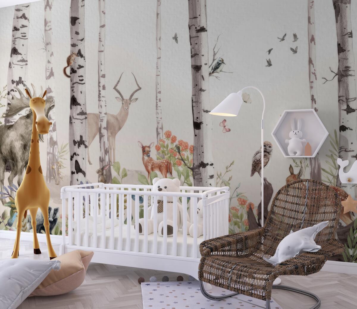 Papier peint Les animaux marchent dans la forêt entre les arbres (article a97916 ) de la catégorie Papier peint Pour les enfants