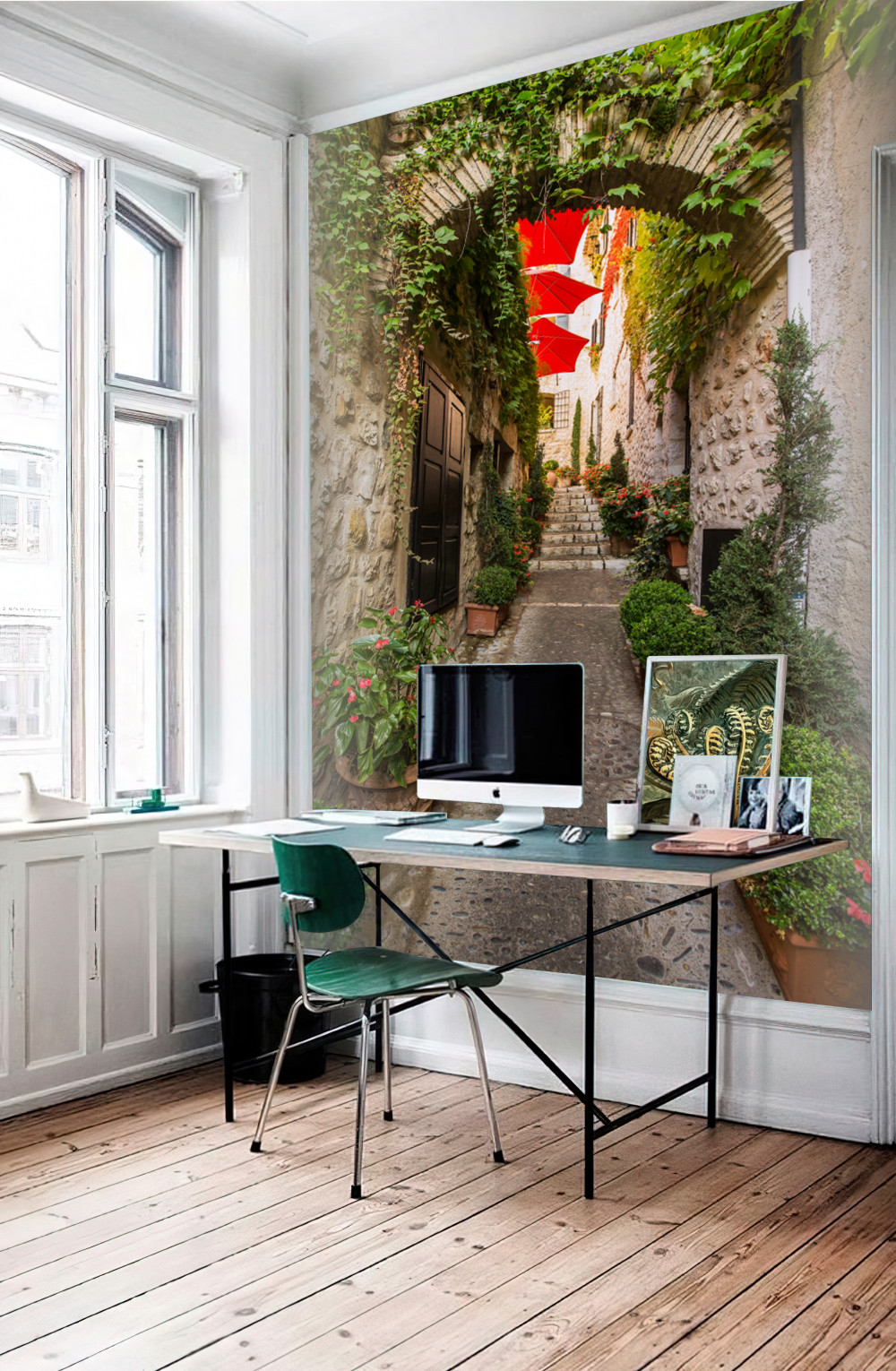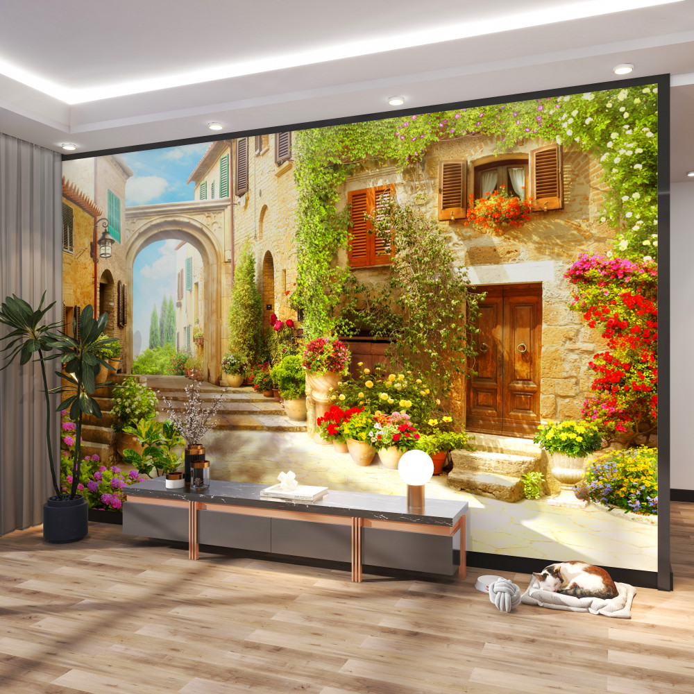 Papier peint escalier avec des fleurs dans l'ancienne cour