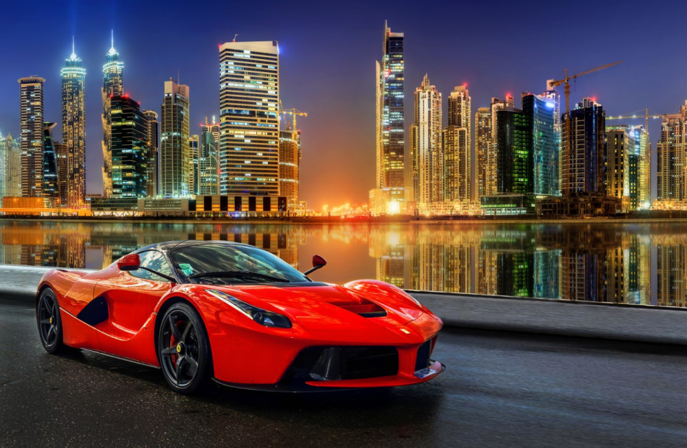 Papier peint Voiture de sport en arrière-plan de la ville de la nuit